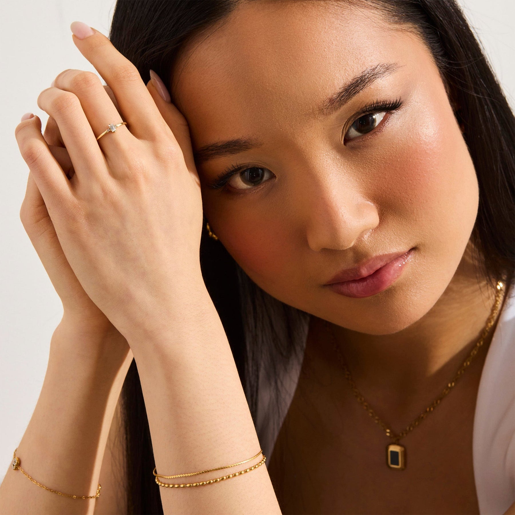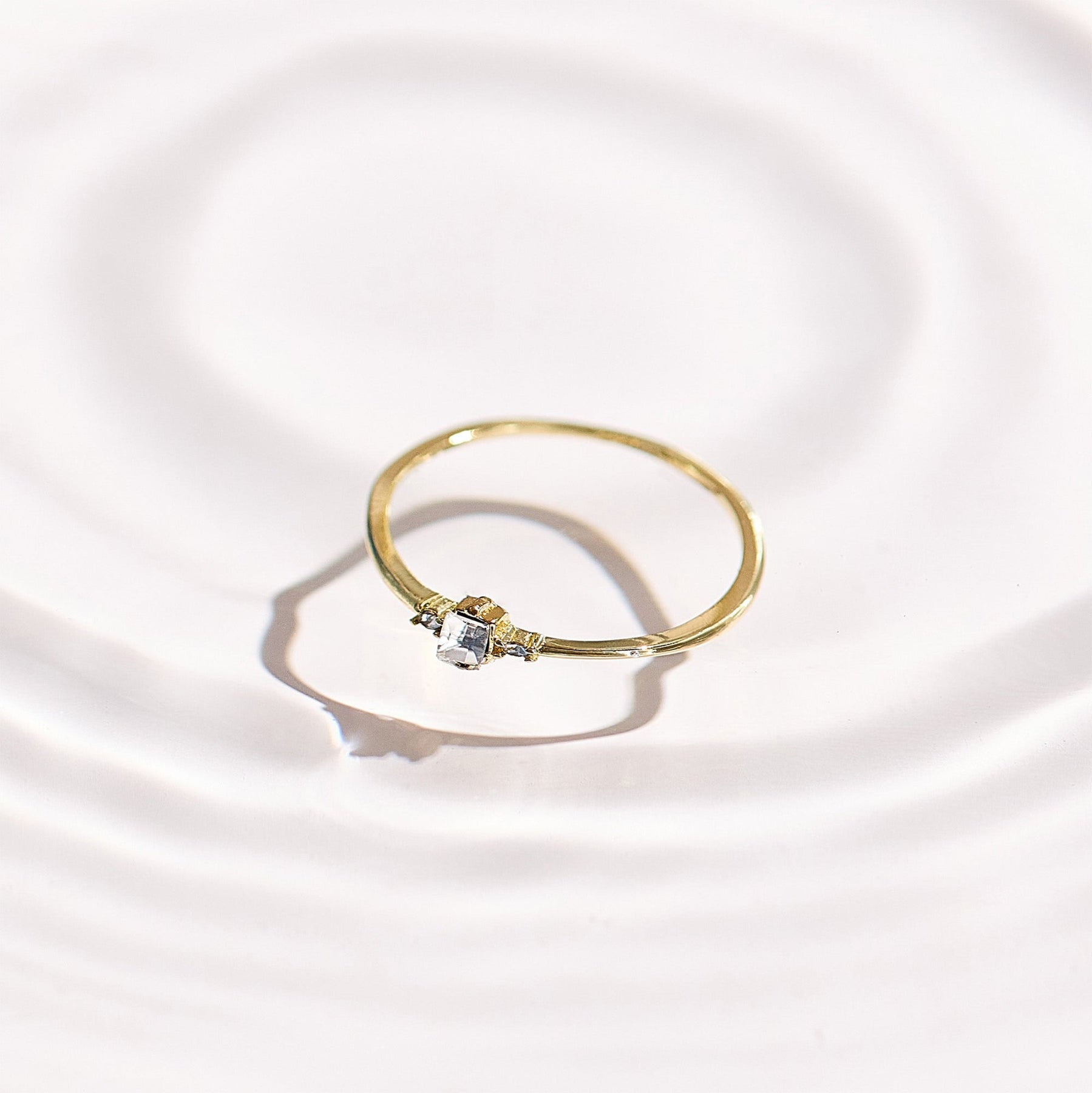 Delicate yet daring, the Temptress Ring is a masterclass in subtle seduction. Its slender golden band cradles a radiant baguette-cut stone, flanked by two petite gems — like a secret kept just between you and the sparkle.